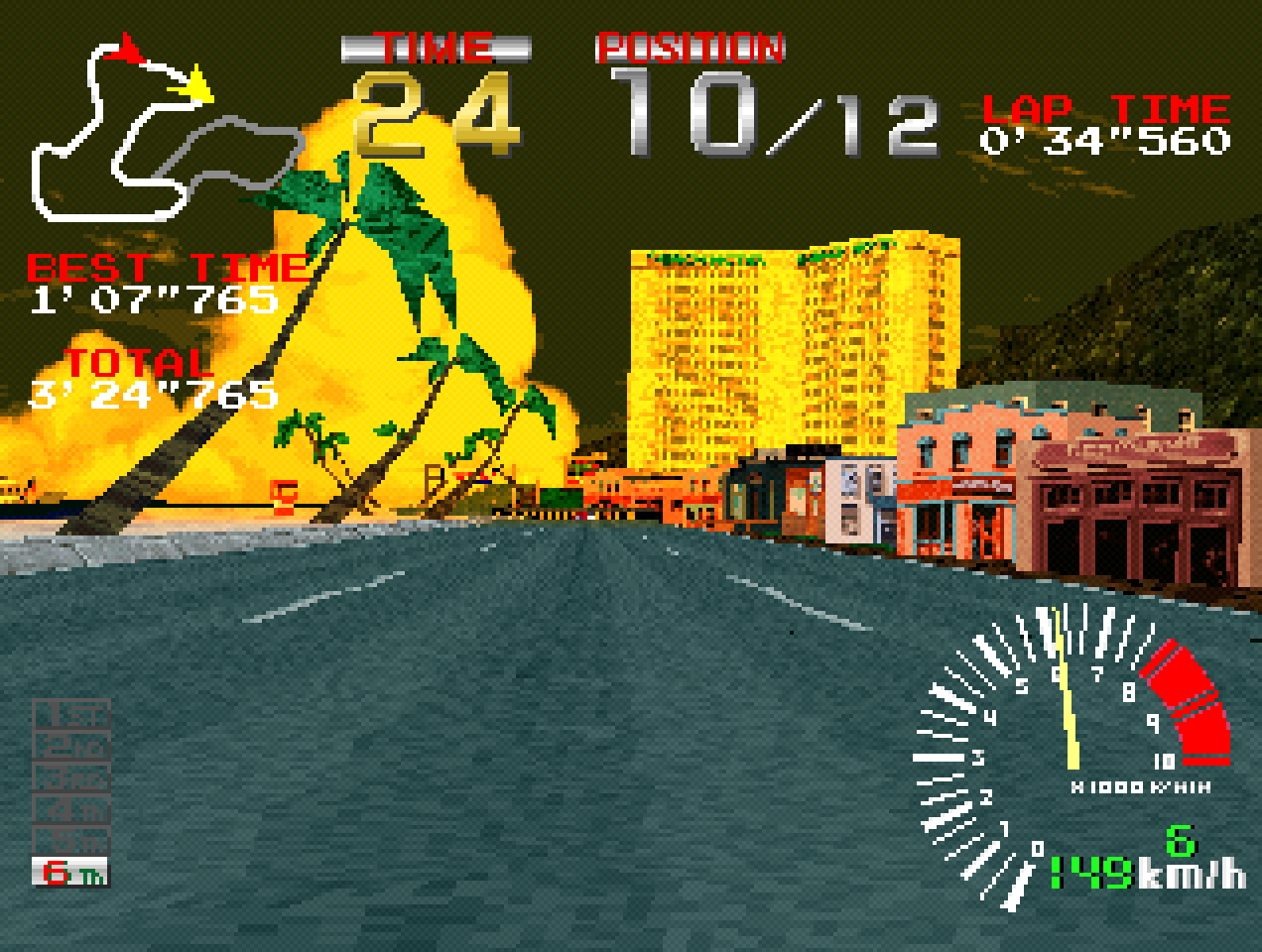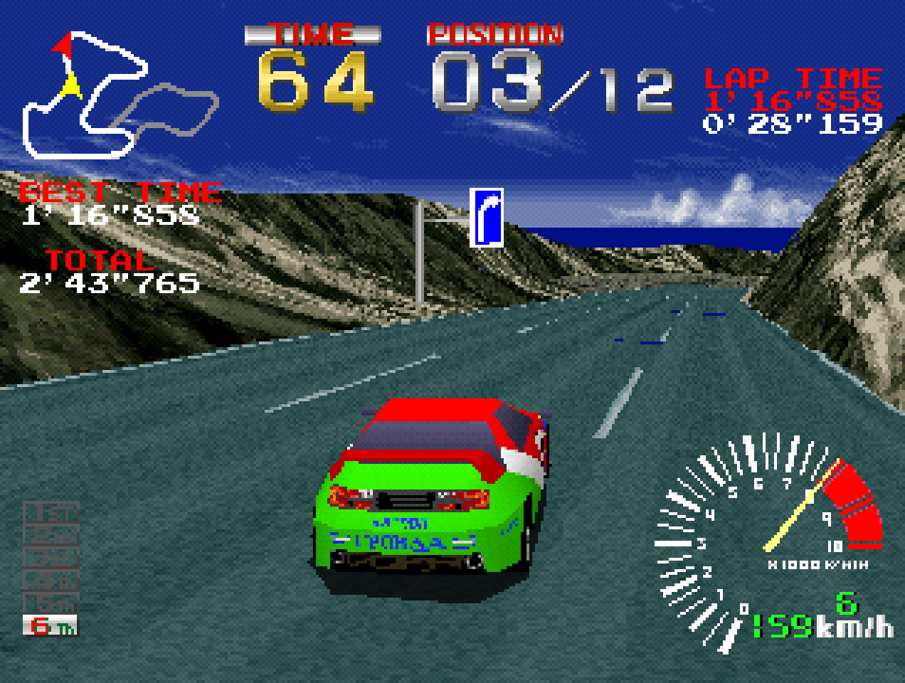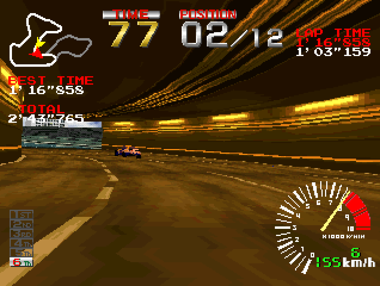 Pour l’instant j’ai du mal à faire de bons scores, je maîtrise pas assez bien le jeu pour savoir si il y a le fameux véhicule Devil 13 à débloquer en finissant premier partout puis en le battant en terminant devant. A l’époque c’etait en quelque sorte le big boss du jeu, mais vu qu’il s’agit du portage PS1 je suppose que oui, le contraire serait étonnant.