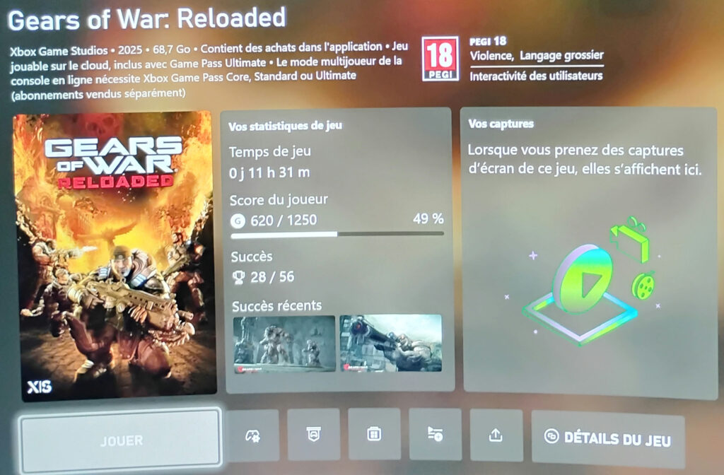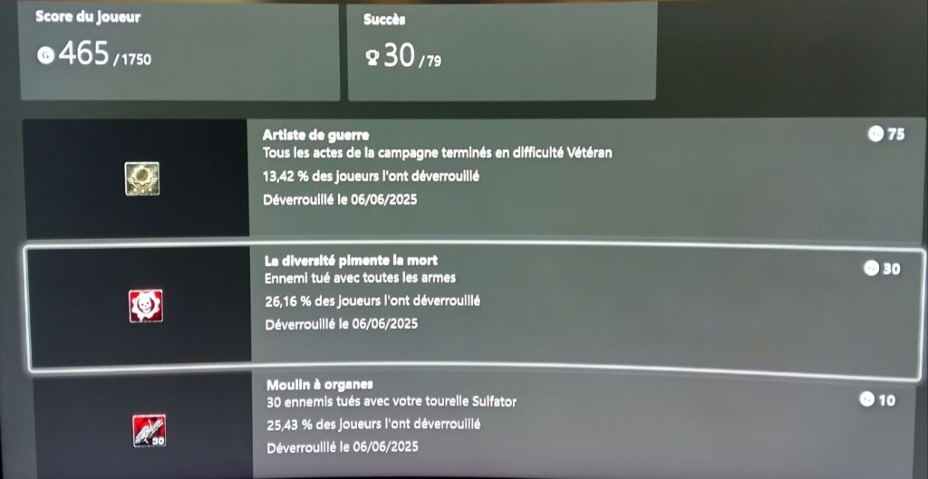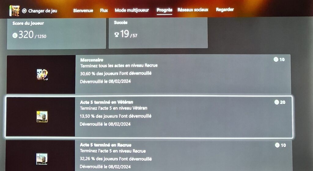 Au niveau des succès je n’ai pas joué en ligne et seul je n’ai pas lancé le dernier niveau de difficulté, voici ou j’en suis actuellement. 320/1250G pour un total de 19/57 succès.