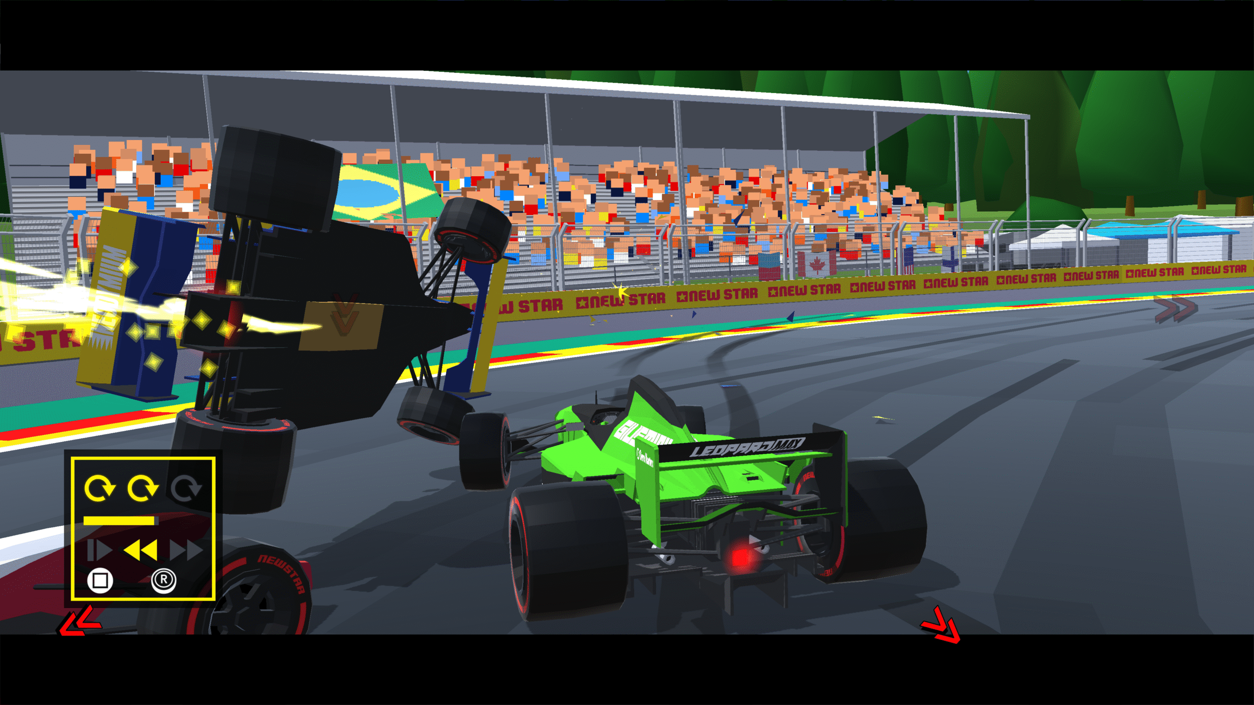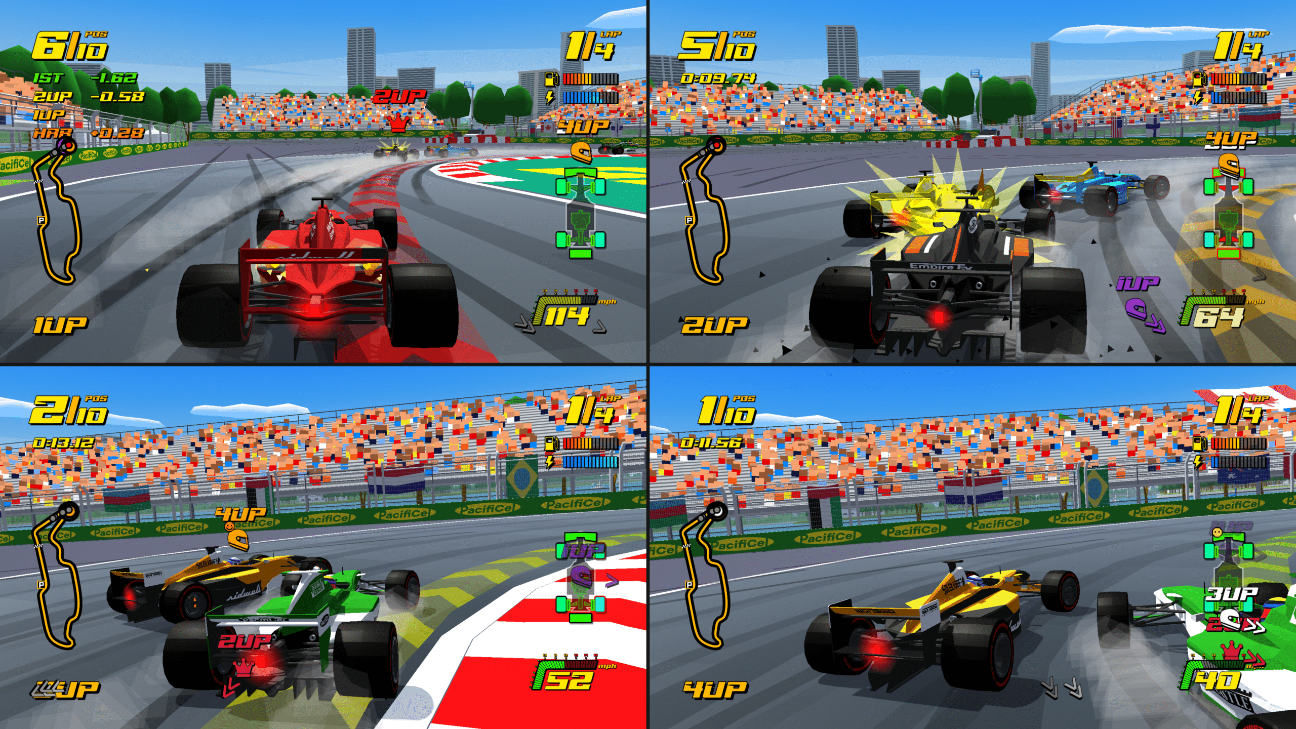 Côté technique, l’aspect old-school de l’ensemble est très bien rendu, graphiquement c’est très bon, le framerate est stable et l’ensemble ne rame pas. Les circuits sont dotés de moult détails qui rendent les courses vivantes. Avions ou oiseaux qui passent dans le ciel, ballots de poussière qui traversent la piste, foule et fumigènes dans les tribunes ou encore panneaux lumineux animés permettant au joueur de s’immerger totalement dans chaque épreuve.