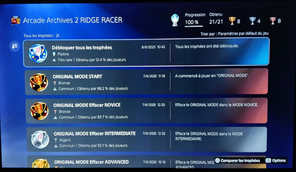 Ridge Racer premier du nom, sorti au départ sur la première Playstation à droit plusieurs décennies plus tard à un portage sur PS4 et PS5. Epoque oblige le titre gagne quelques améliorations comme un meilleur rendu graphique pour pouvoir être jouable sur les écrans d’aujourd’hui, le rembobinage, la sauvegarde rapide et des filtres vidéo personnalisés. Alors je ne sais pas ce que sont les filtres vidéo personnalisés, j’en ai absolument aucune idée. Le jeu est comme à l’époque au format 4/3 avec des bandes noires sur les côtés et n’a pas de trophées.